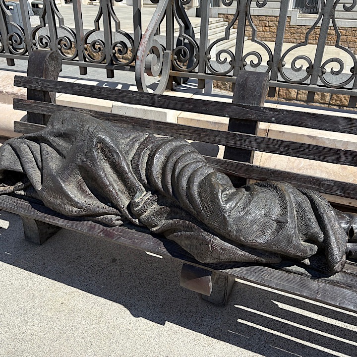A short ‘treasure hunt’ from Marsh took us to a recent but moving statue ‘Escultura Jesús Desamparado’ by Thimoty Schmalz depicting Jesus as a homeless man sleeping on a park bench.